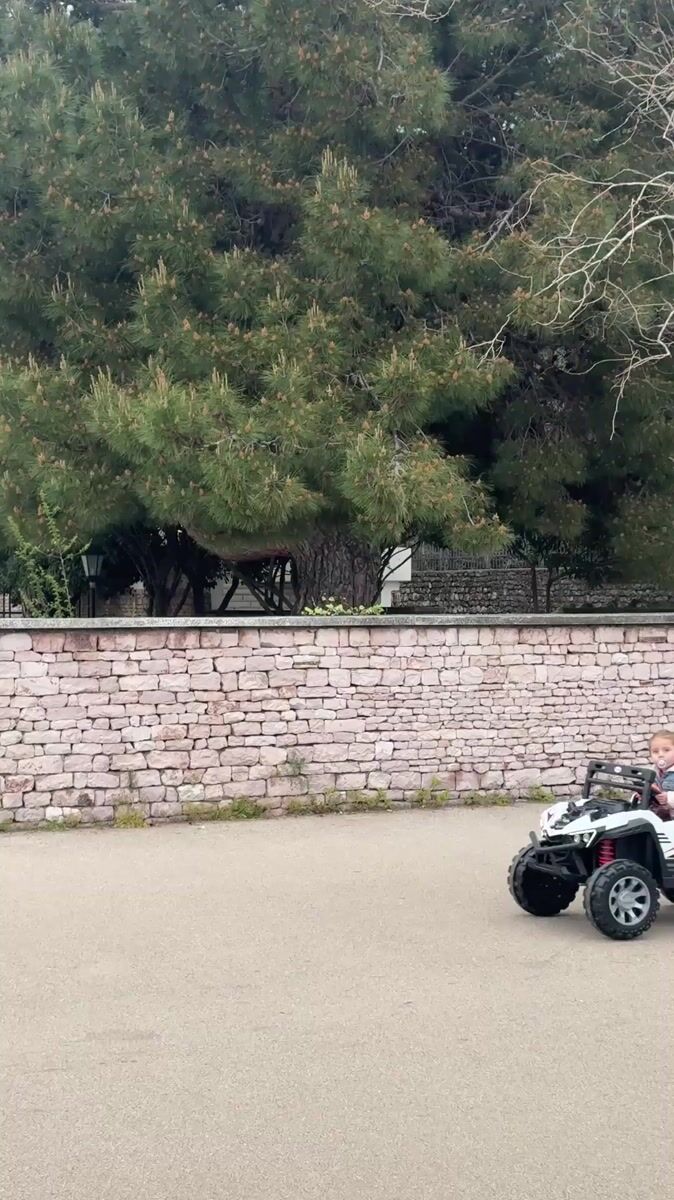 Children ride toy car along road in Bar, Montenegro