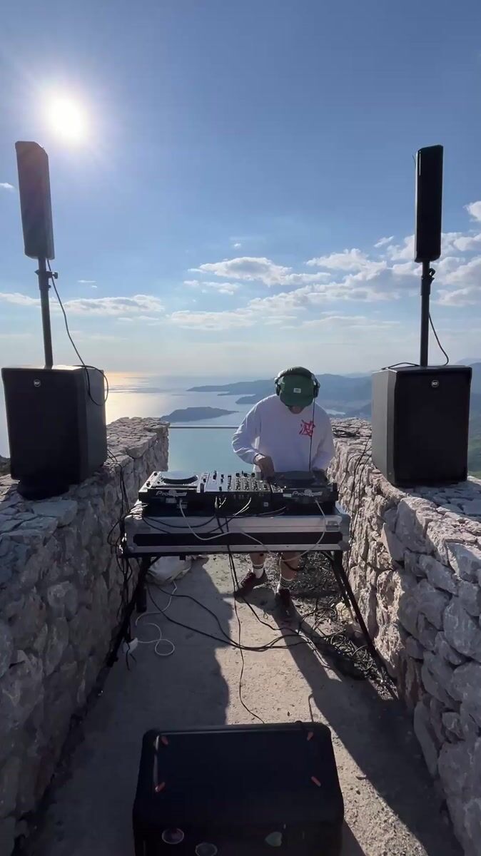 DJ performs on historic stone structure overlooking Montenegro coastline