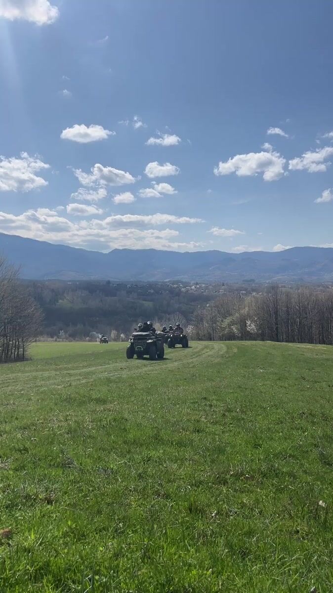 Four ATV riders cross green field near Apriltsi, Bulgaria