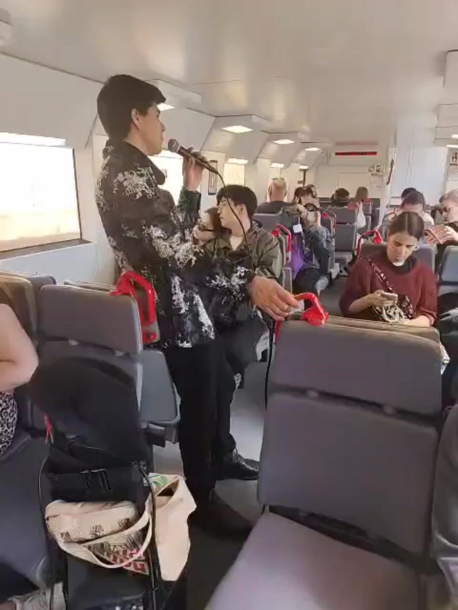 Topics: train performance, microphone singing, floral jacket, public transport, street musician, entertainment, urban performance, public space, music, transit