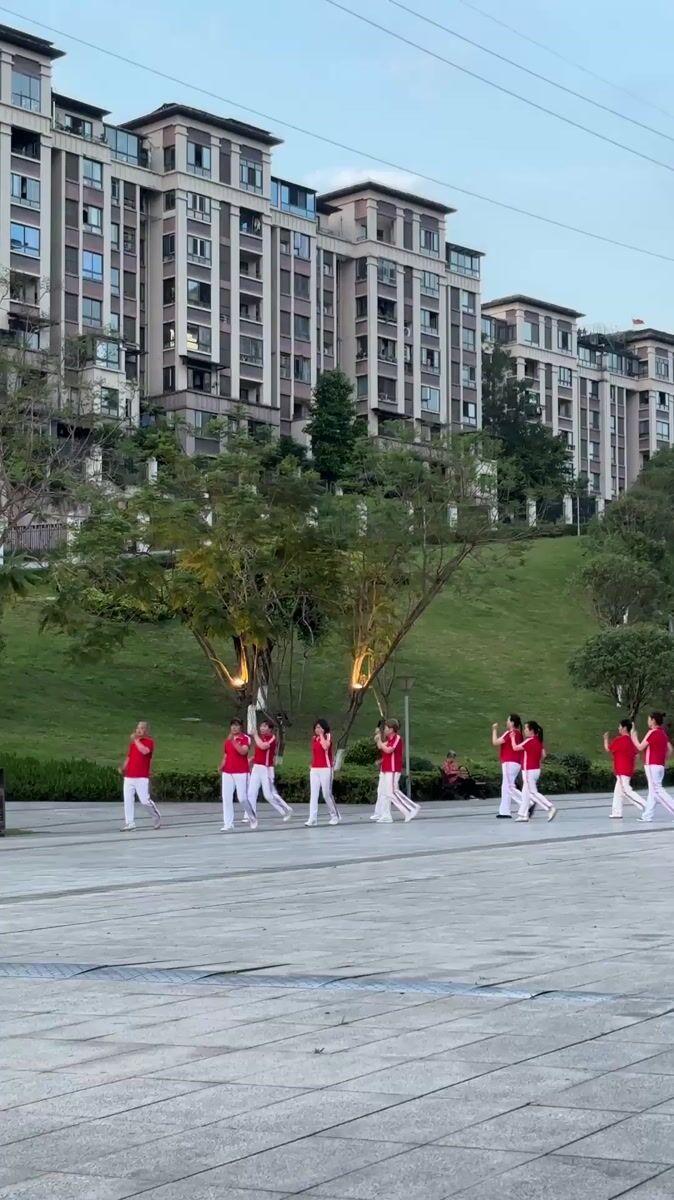 Topics: group exercise, tree maintenance, municipal work, park activity, synchronized walking, urban maintenance, public space, community, daily life, urban
