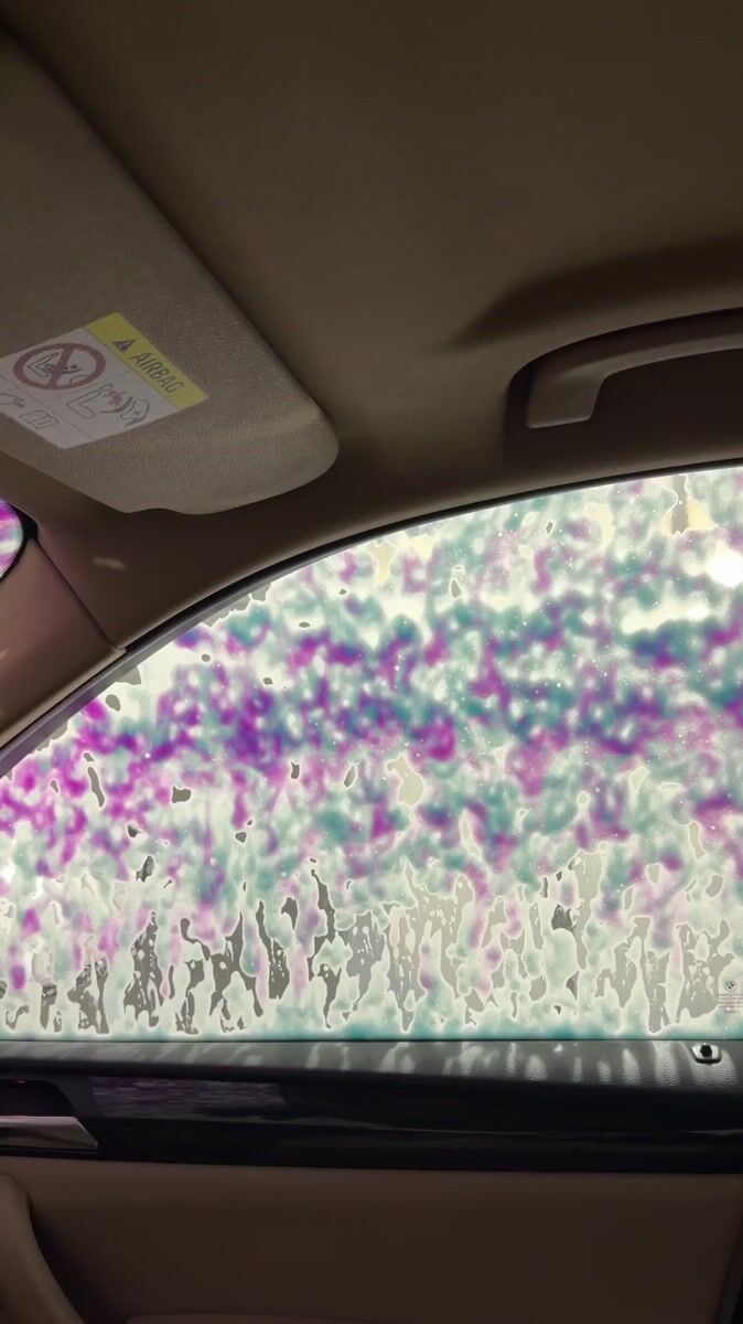 Topics: car wash, soap bubbles, windshield view, vehicle maintenance, automotive service, colorful foam, daily routine, urban service, transportation, daily life