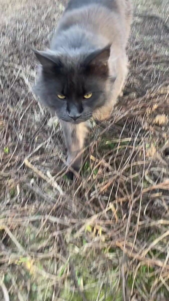 Topics: cat behavior, evergreen tree, golden hour, animal exploration, countryside, natural light, rural setting, nature, daily life, peaceful