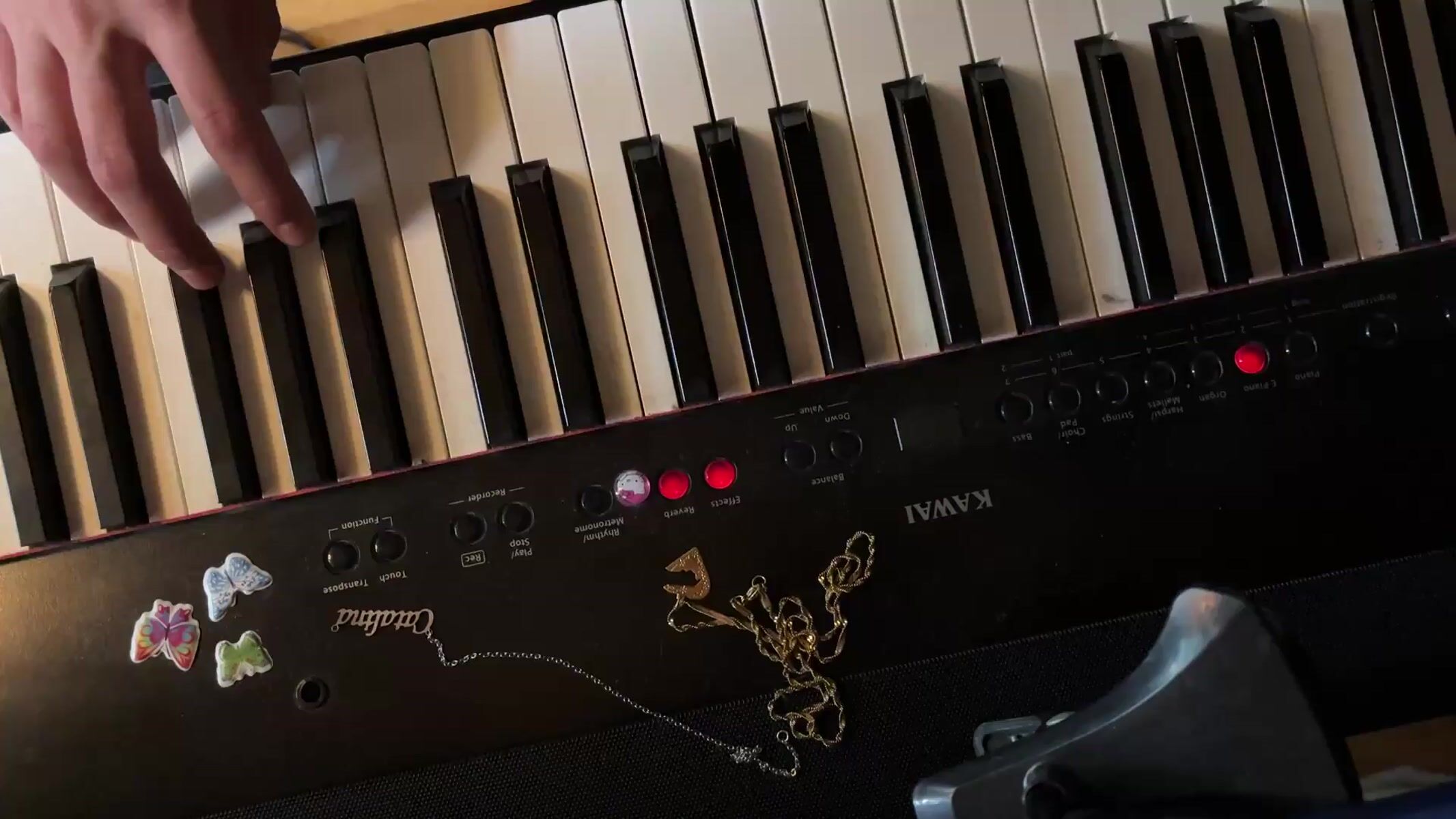 Topics: piano session, kawai digital, butterfly decoration, music performance, indoor activity, rainy weather, artistic expression, music, indoor, daily life