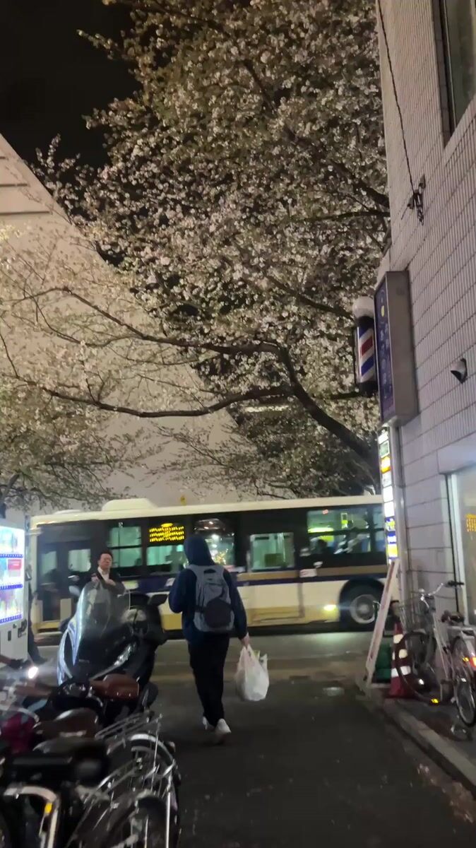 Cherry blossoms illuminate nighttime street scene in Nakano City