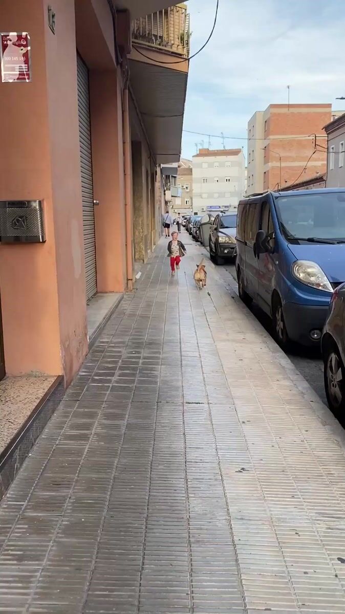 Boy runs with dog on Lleida sidewalk