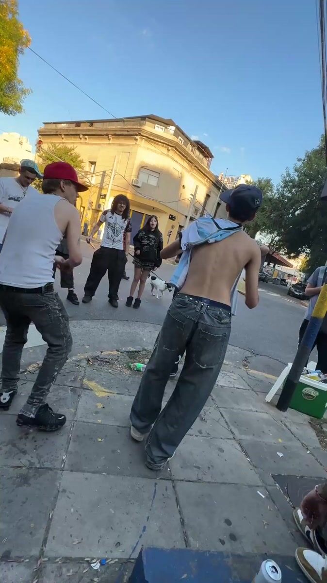 Topics: street performance, soccer jersey, crosswalk gathering, youth culture, street corner, evening activity, urban, social, entertainment, daily life