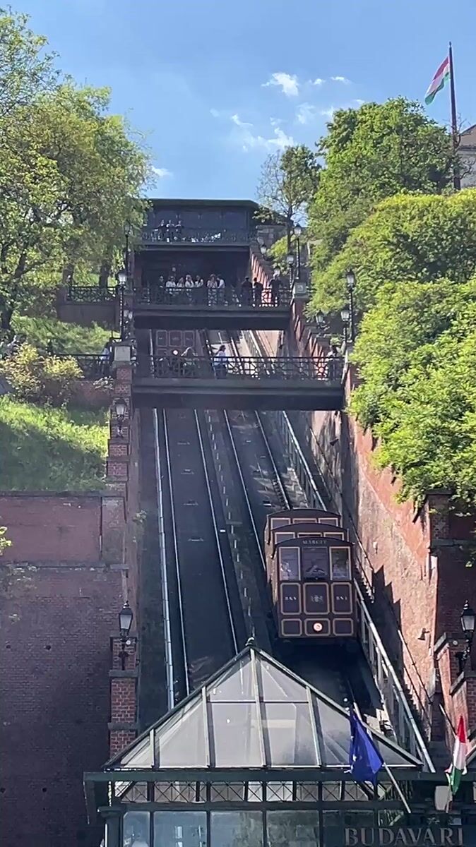 Topics: funicular railway, maroon car, steep incline, public transport, budapest transport, railway system, urban transit, transportation, infrastructure, daily life