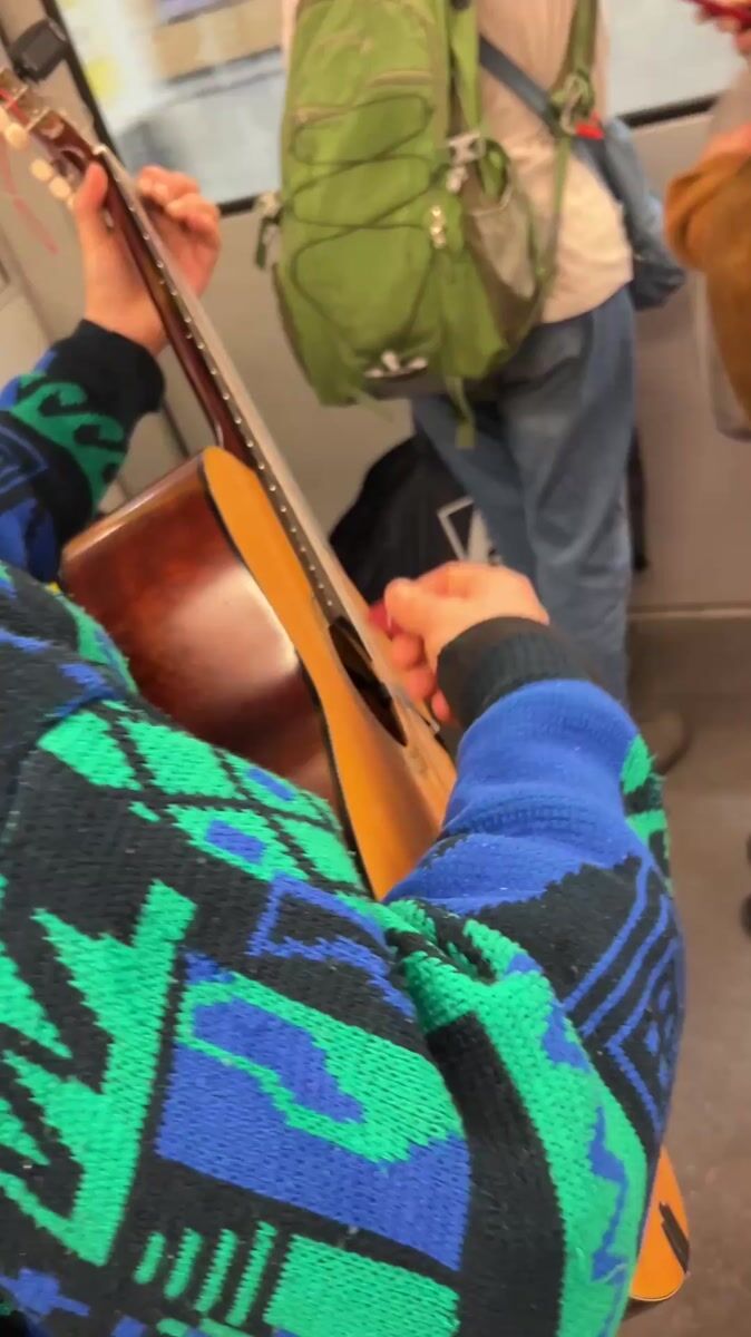 Topics: street musician, train performance, guitar playing, public transport, busking, music, commuter culture, urban life, entertainment, daily life