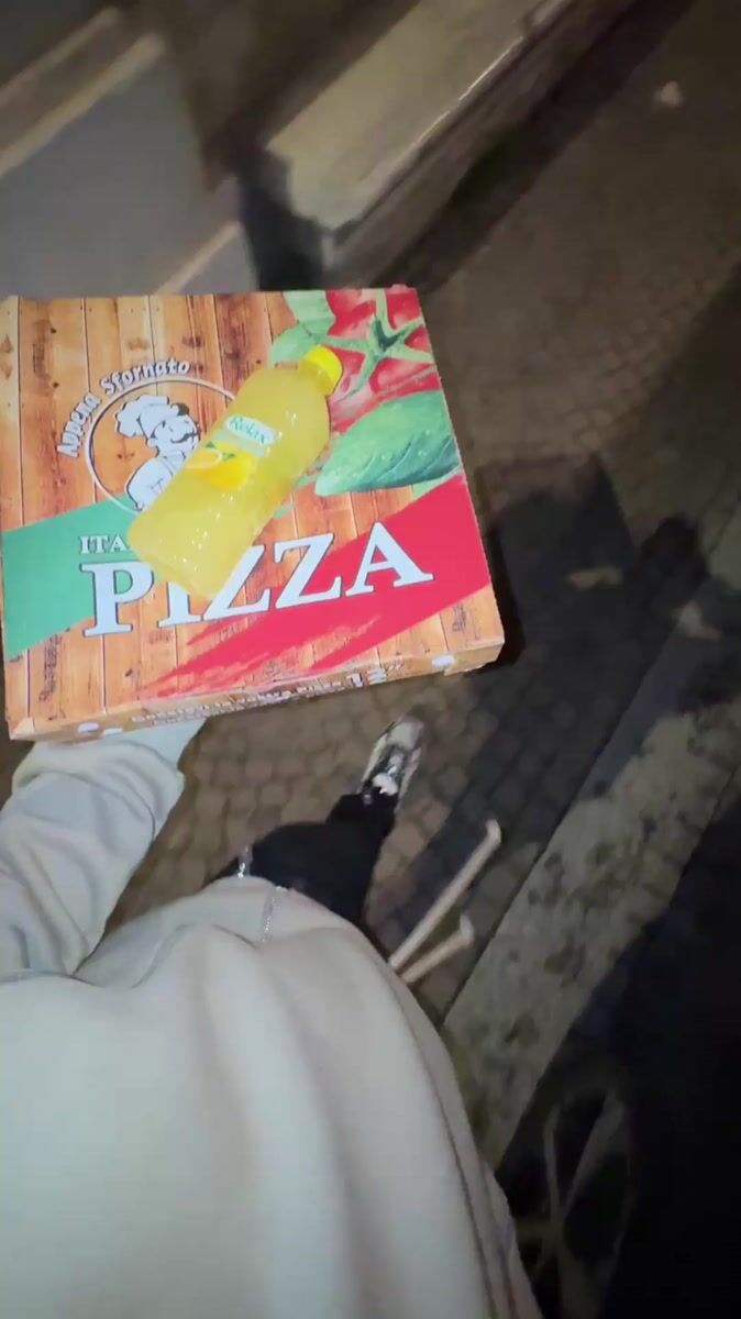 Topics: rain slicked, cobblestone street, pizza takeout, historic column, medieval architecture, nighttime, evening walk, italian city, urban, daily life