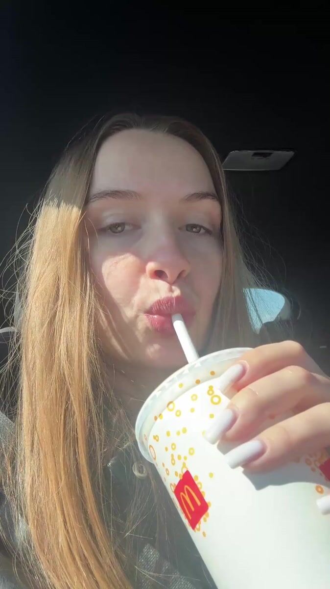 Topics: mcdonalds beverage, car drinking, straw consumption, fast food, vehicle interior, casual dining, daily life, consumer, urban, mundane