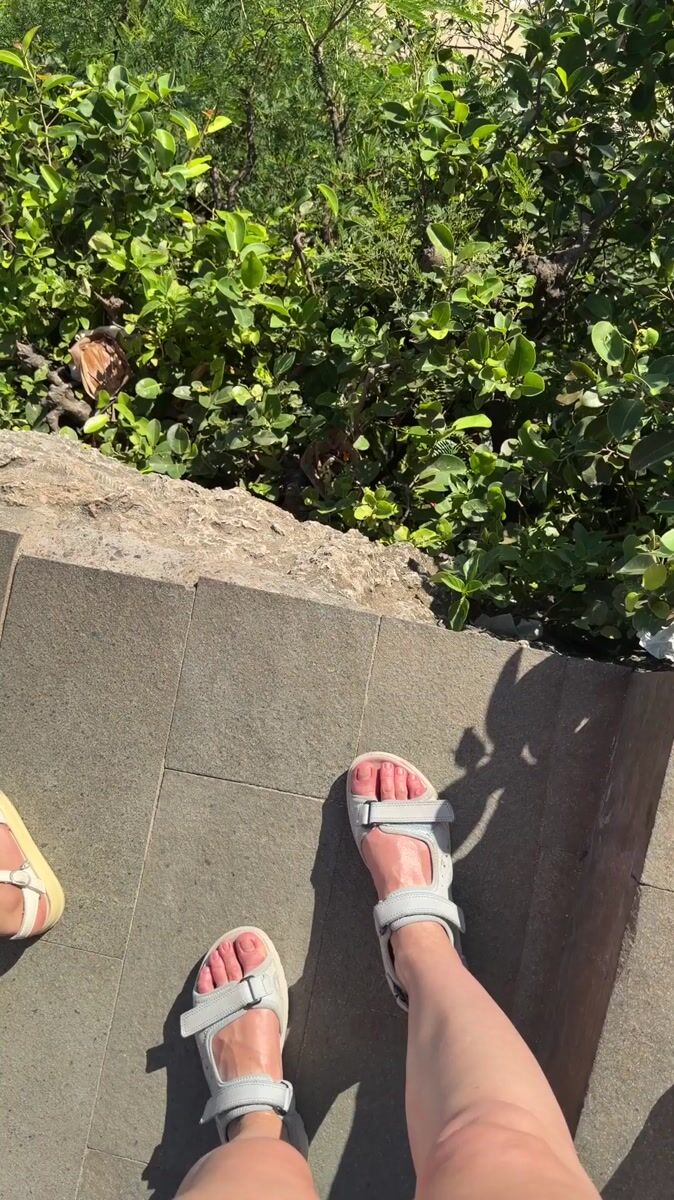 Two people in grey sandals filmed on stone tiles, Nusa Penida
