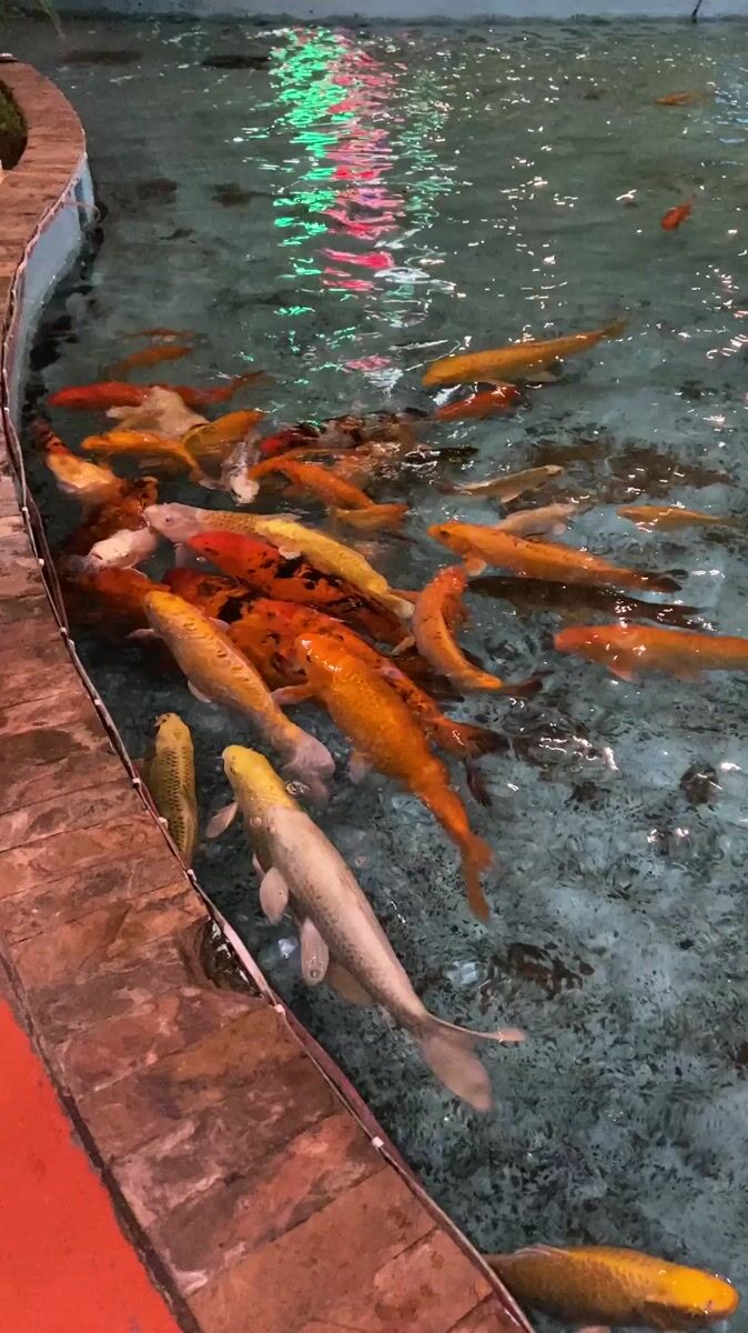 Topics: koi pond, fish feeding, aquarium, family activity, shopping center, indoor recreation, leisure, commercial, evening, daily life