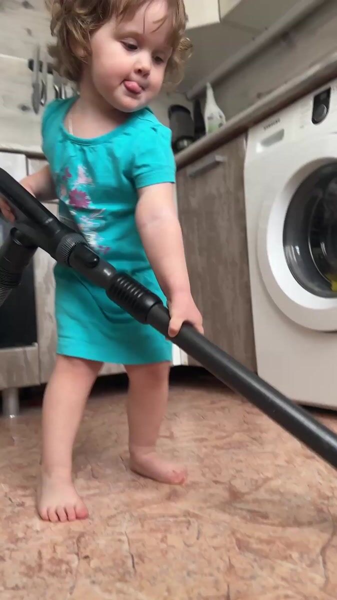 Toddler helps with morning chores in Chaikovsky home