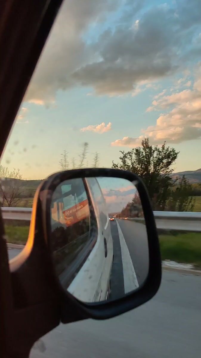 Topics: highway driving, sunset travel, evening commute, vehicle journey, road trip, transportation, landscape, rural travel, daily life, movement