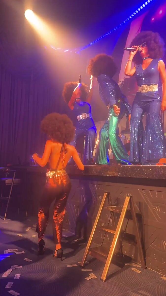 Topics: disco performance, aerial acrobat, retro costume, nightclub entertainment, live music, choreographed dance, bar venue, stage show, nightlife, entertainment