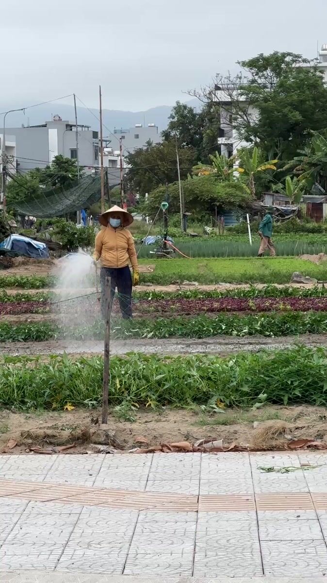Topics: crop watering, street vendor, excavator work, morning routine, agriculture, commerce, construction, daily life, urban, vietnam