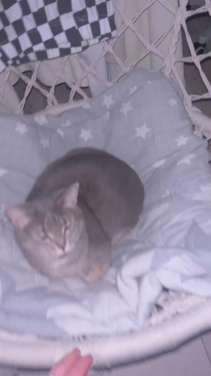 Topics: gray cat, hanging chair, star pattern, indoor pet, tabby cat, home furniture, domestic animal, interior, relaxation, daily life
