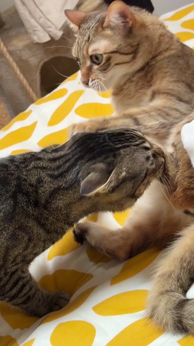 Two cats share quiet moment on Milan bedroom bedLocation: Milan, Italy4/18/20261 sources from 2 citizen journalistsTopics: tabby cats, bedroom nuzzling, domestic cats, pet behavior, indoor scene, animal bonding, bedroom, domestic life, pets, daily lifeSource MediaPhoto source: 99455097Photo source: 93573f86