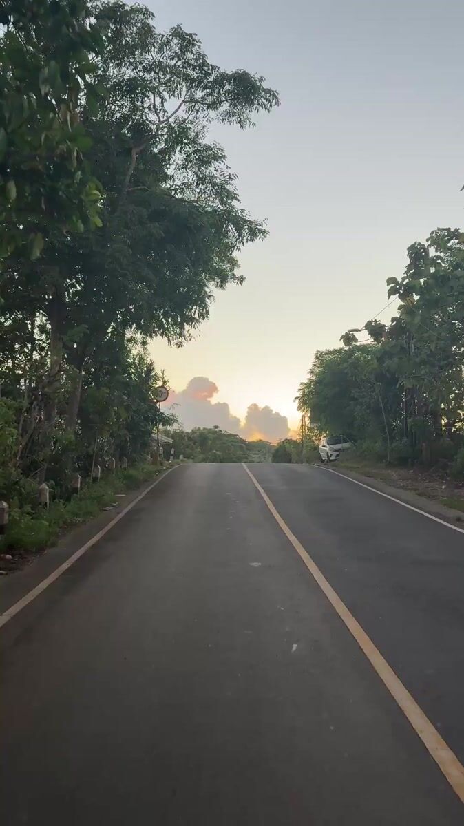 Topics: paved road, yellow divider, overcast sunset, roadway, transportation, evening, infrastructure, urban, travel, daily life