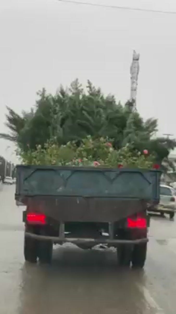 Topics: flower truck, rose delivery, rainy streets, transport, commercial, urban, weather, daily life, afghanistan, logistics