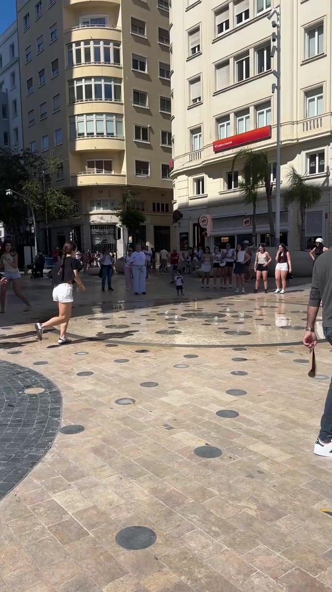 Topics: fountain play, water jets, children playing, public square, outdoor recreation, urban playground, family activity, leisure, public space, daily life