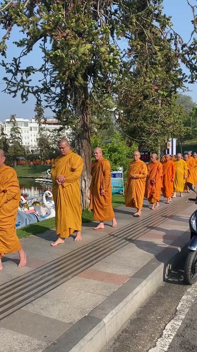 Topics: buddhist procession, orange robes, barefoot monks, religious ceremony, tourism area, cultural practice, spiritual, vietnamese culture, public space, daily life
