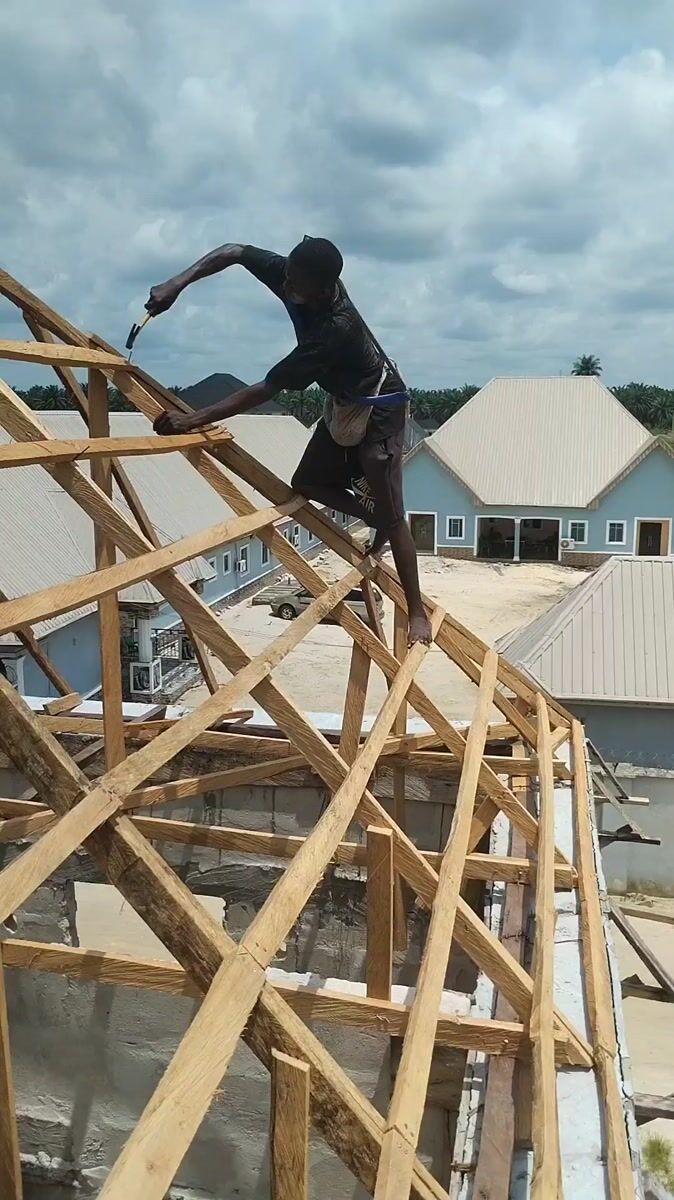 Construction worker builds roof frame in Agbarha-Otor, Nigeria