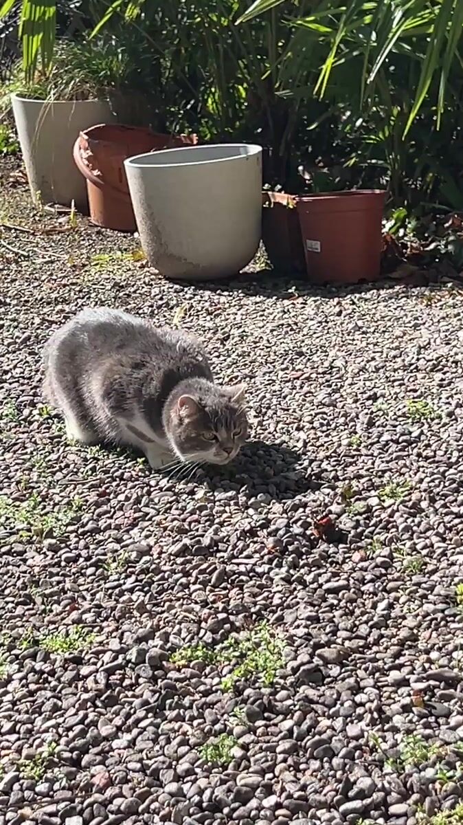 Topics: domestic cat, yellow collar, gravel yard, pet observation, residential area, outdoor setting, animal behavior, daily life, domestic, urban