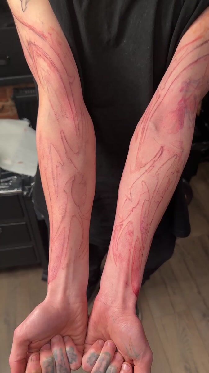 Topics: tattoo stencil, red outline, forearm display, body art, street fashion, personal expression, urban culture, artistic, lifestyle, social