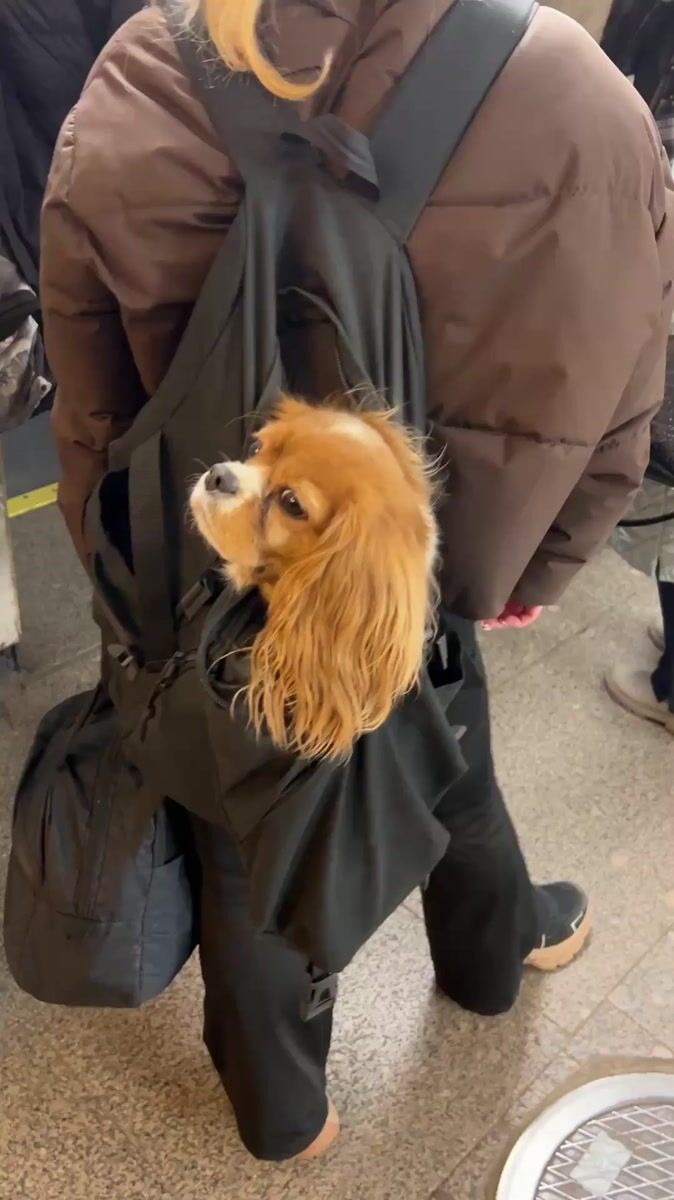 Topics: puppy backpack, cavalier spaniel, subway station, pet transport, public transit, urban commute, animal companion, daily life, transport, social