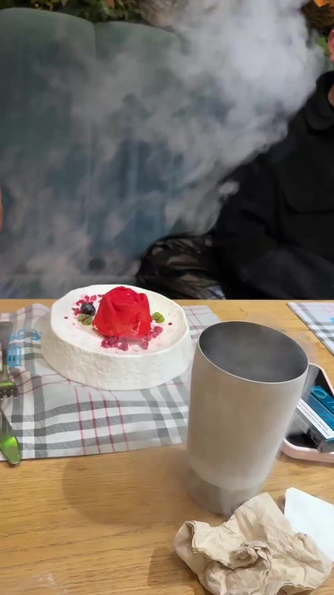 Topics: smoke effect, dessert presentation, theatrical dining, restaurant, fine dining, food entertainment, culinary, hospitality, dining, indoor