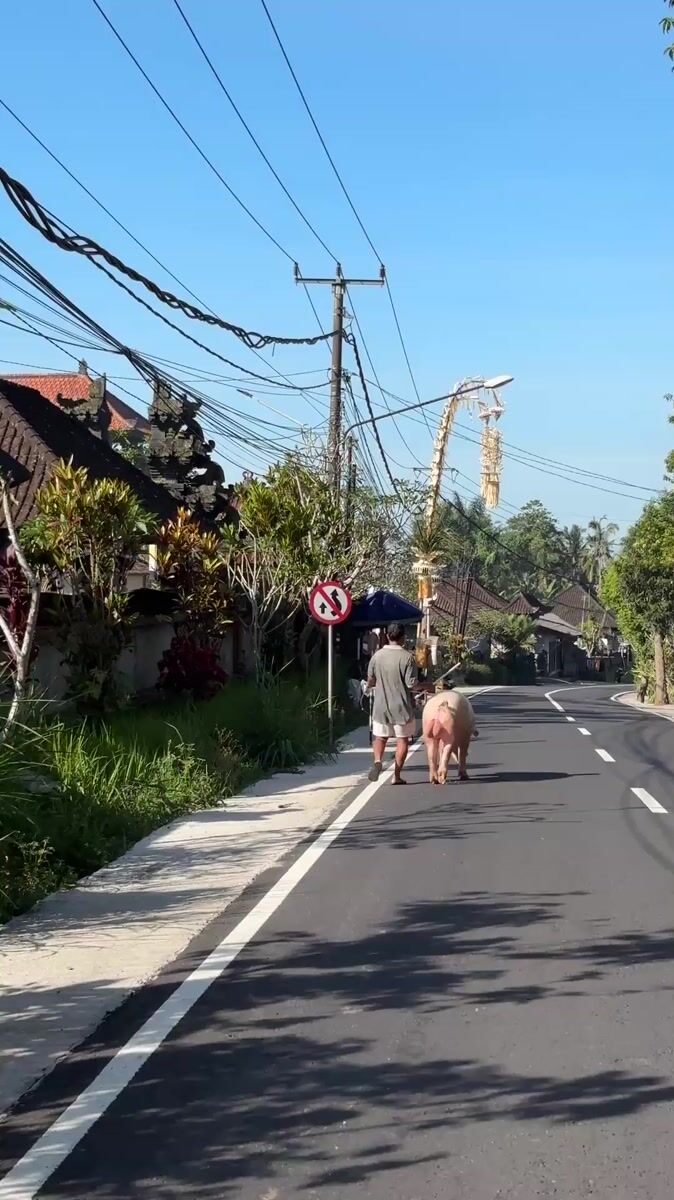 Man walks pig on rope along road in Payangan