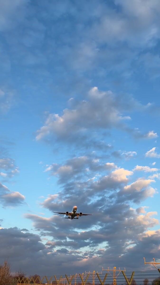 Topics: aircraft landing, airplane descent, overhead flight, aviation, air travel, sky observation, transportation, urban, daily life, travel