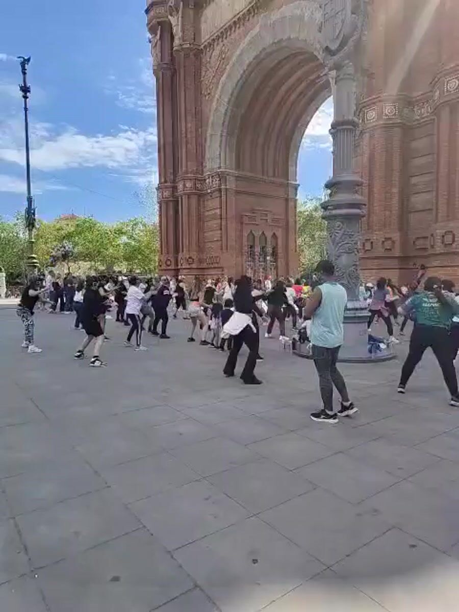 Diverse group performs synchronized dance at Barcelona's Arc de Triomf