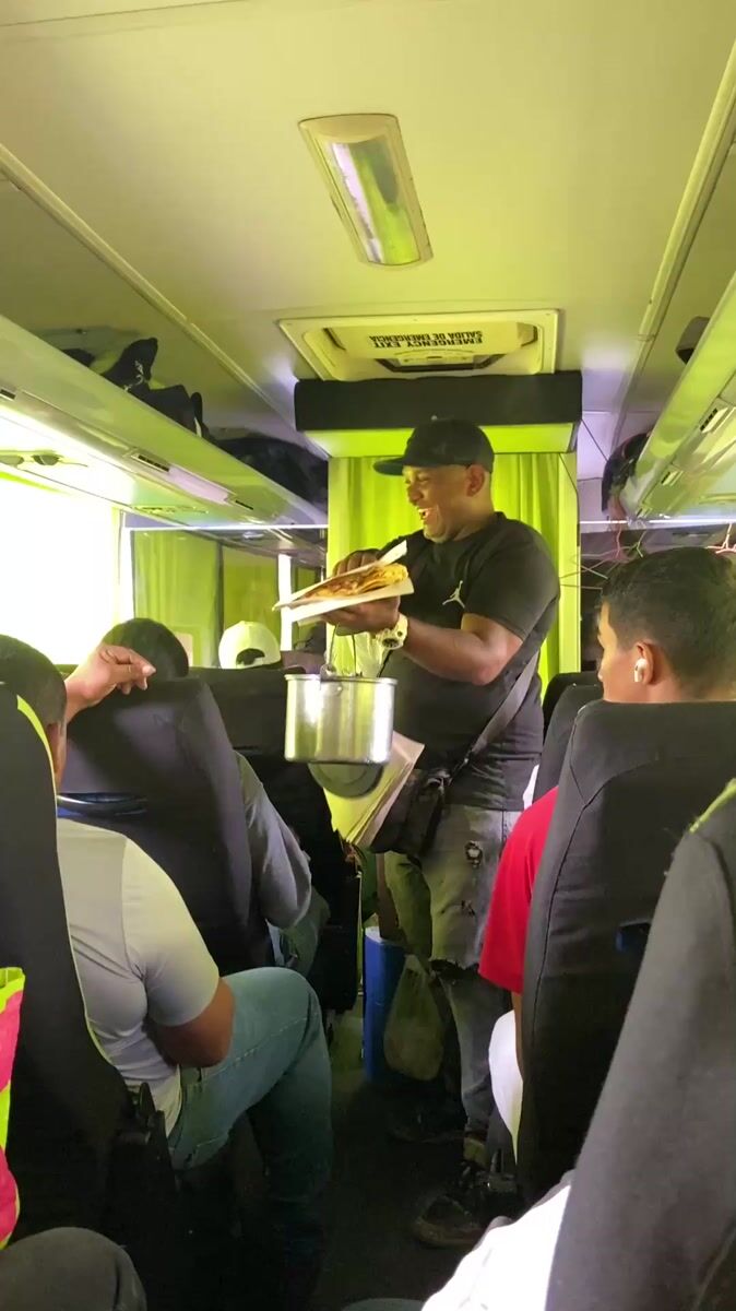 Food vendor sells fried plantain sandwiches on Venezuelan bus