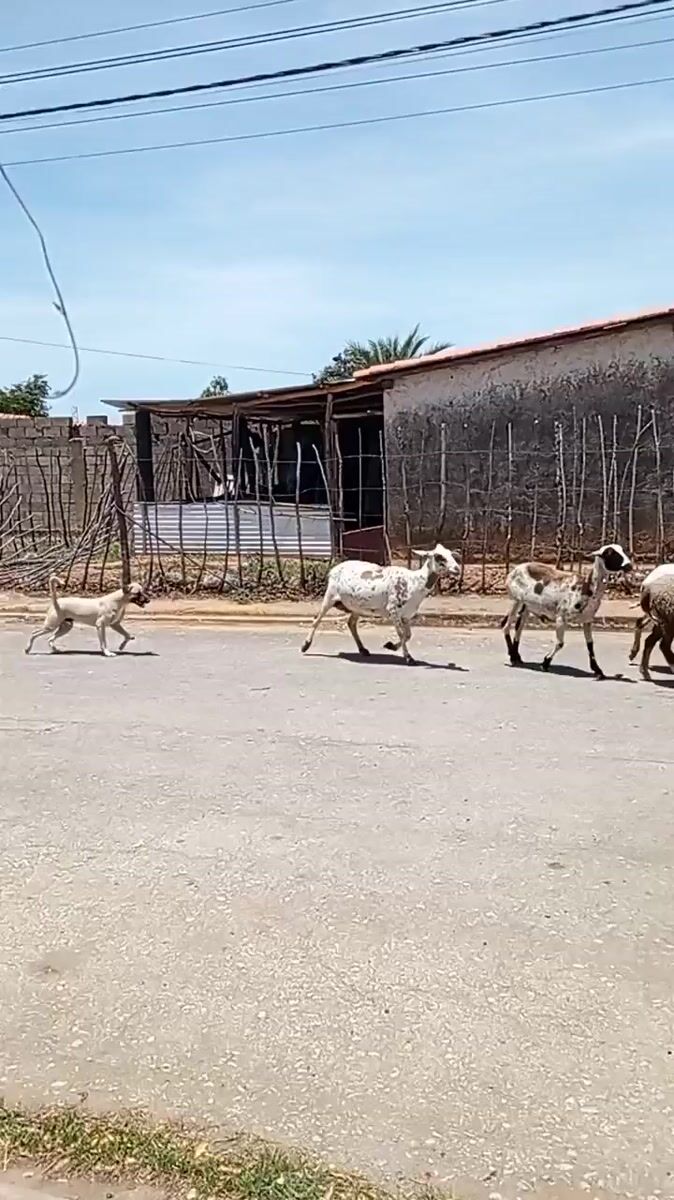 Topics: sheep herding, dog behavior, residential street, animal herding, livestock, street scene, rural activity, animal, daily life, outdoor