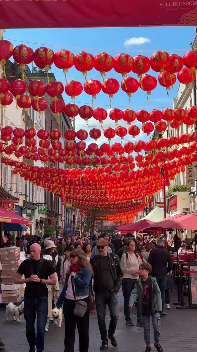 Red Chinese lanterns decorate busy London street