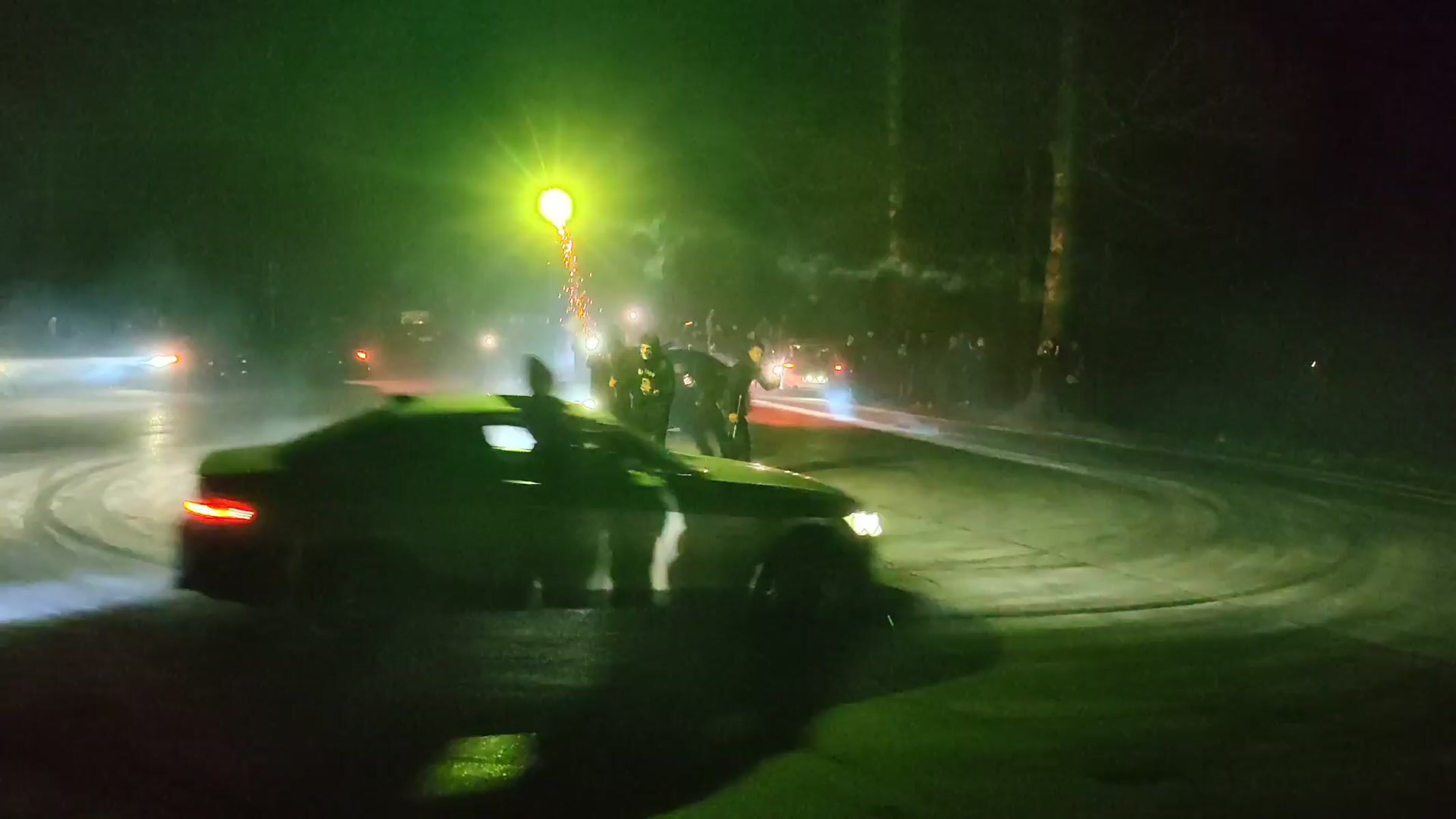 Topics: donut maneuver, wet road driving, nighttime stunts, street racing, reckless driving, urban driving, night activity, automotive, street, transport