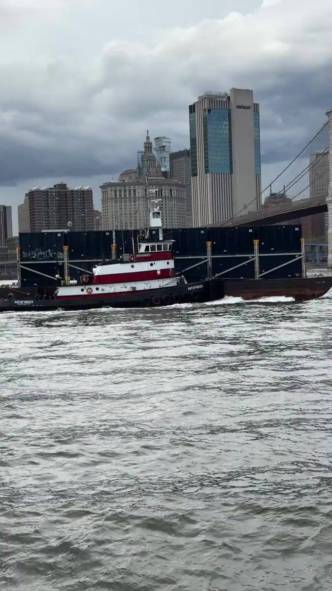 Topics: tugboat, container barge, pathfinder vessel, harbor navigation, maritime transport, new york skyline, shipping, transportation, urban, daily life