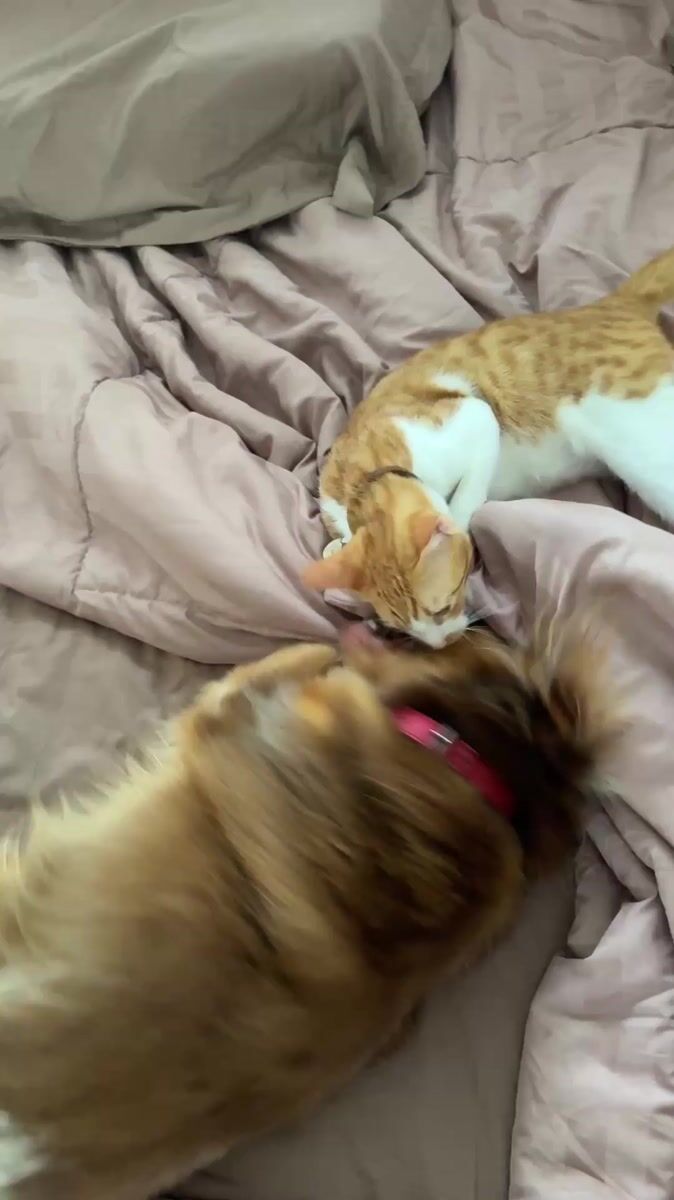 Topics: cat dog play, pet interaction, bedroom scene, animal behavior, pet bonding, indoor activity, domestic life, animal, lifestyle, daily life