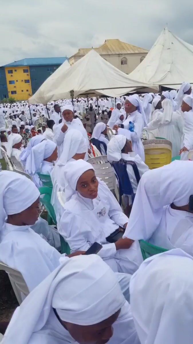 Topics: white robes, religious gathering, outdoor ceremony, religious event, spiritual, community, worship, social, cultural, daily life