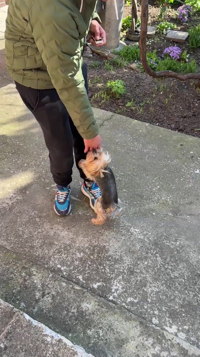Topics: yorkshire terrier, patio scene, pet interaction, outdoor activity, morning scene, residential, pet owner, daily life, domestic, urban