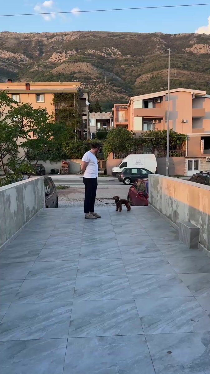 Topics: dog walking, elevated walkway, bridge, pet owner, pedestrian, urban infrastructure, daily life, leisure, coastal town, public space