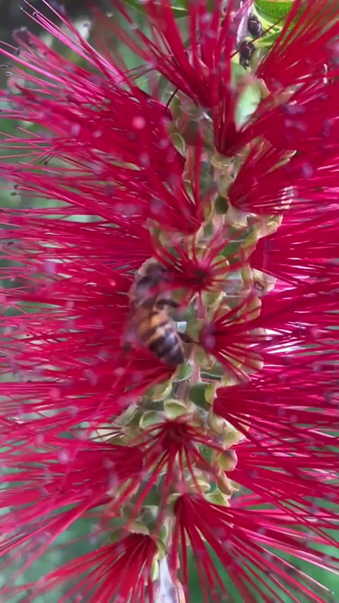 Topics: diamond painting, bee foraging, bottlebrush flower, garden craft, citrus tree, residential garden, hobby, nature, daily life, urban