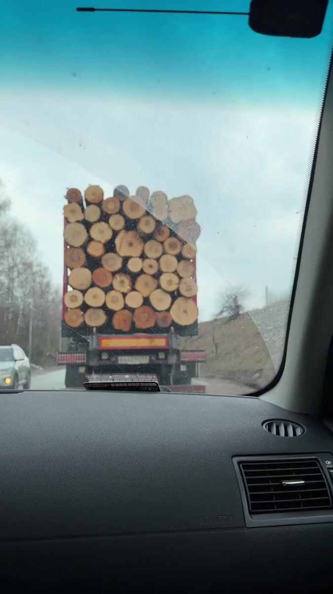 Logging truck carries fresh timber through residential Chaikovsky streets