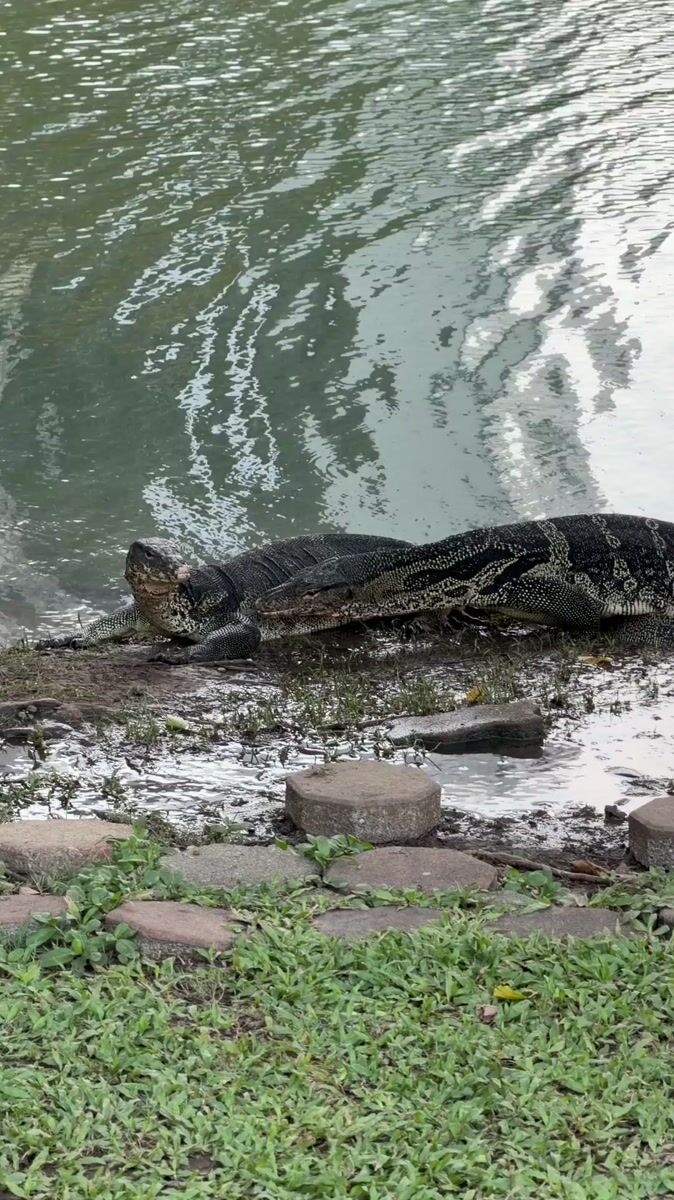 Topics: monitor lizard, urban wildlife, park recreation, nature observation, wildlife spotting, outdoor leisure, urban nature, recreation, wildlife, daily life
