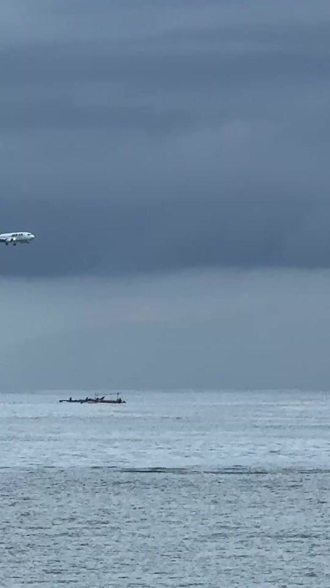 Aircraft descends over Indonesian waters as fishermen work nearby