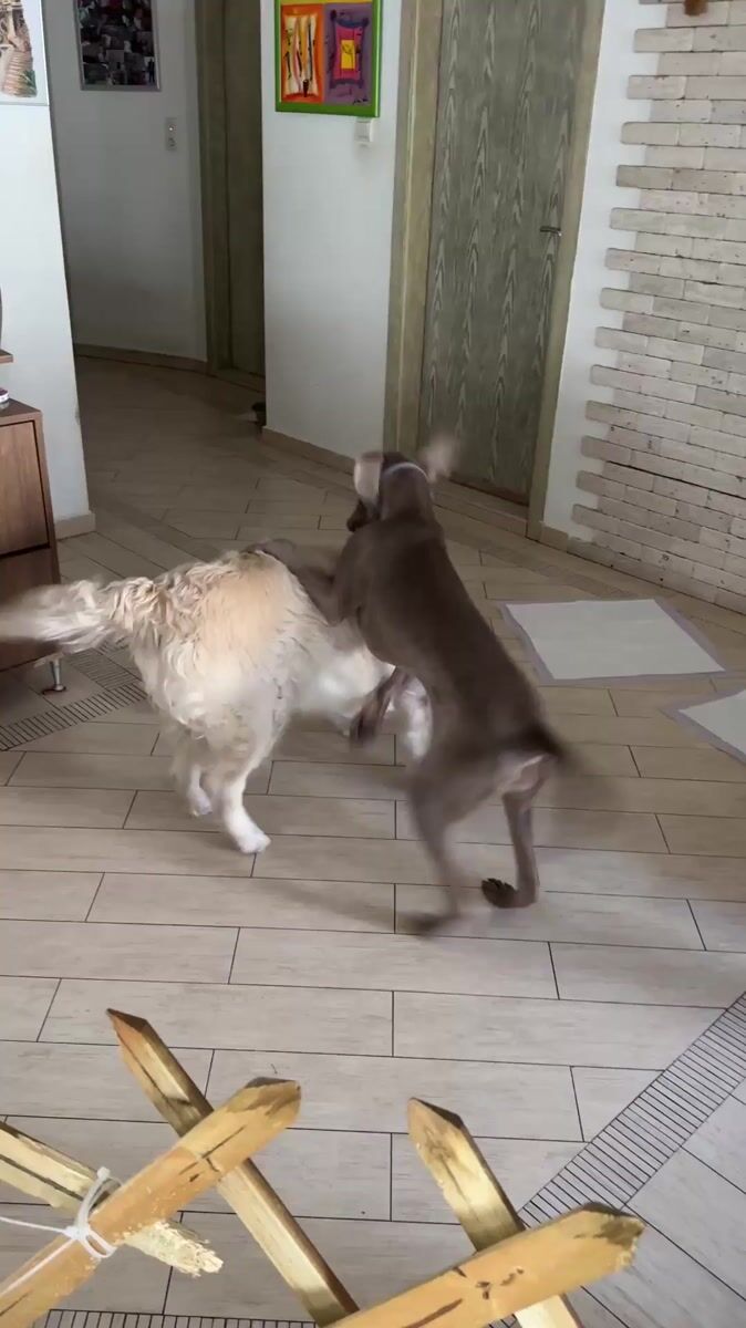Topics: golden retriever, weimaraner, dog play, indoor pets, home setting, domestic animal, pet behavior, residential, daily life, companionship