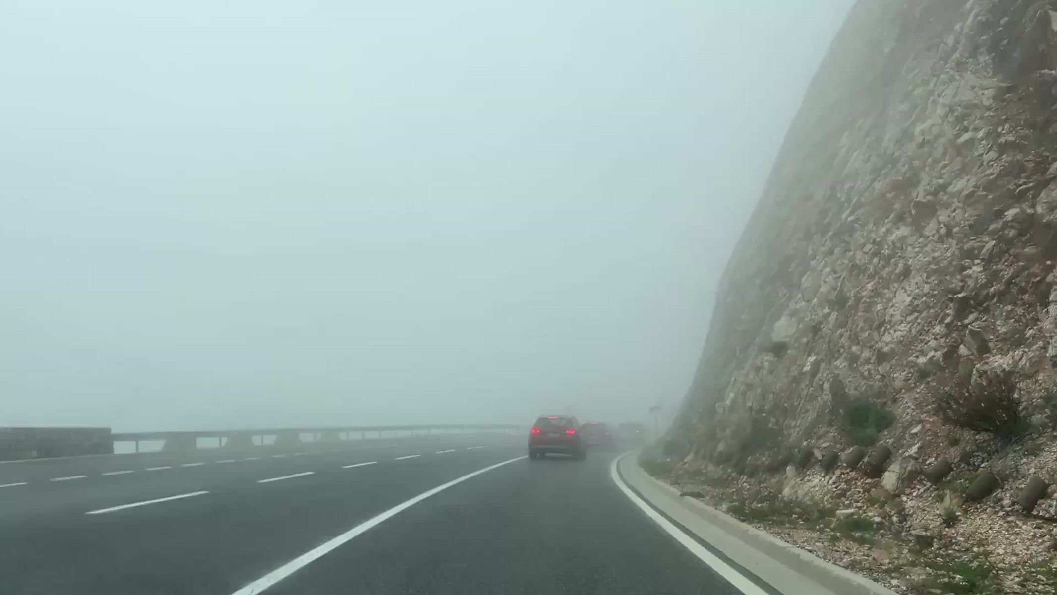 Topics: dense fog, mountain road, driving hazard, poor visibility, weather driving, mountain travel, road conditions, transportation, weather, daily life
